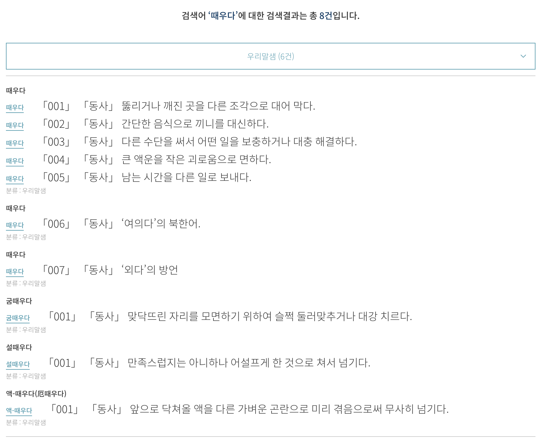 국립국어원에서 '때우다'를 검색해보면 자세한 쓰임새를 알 수 있다.